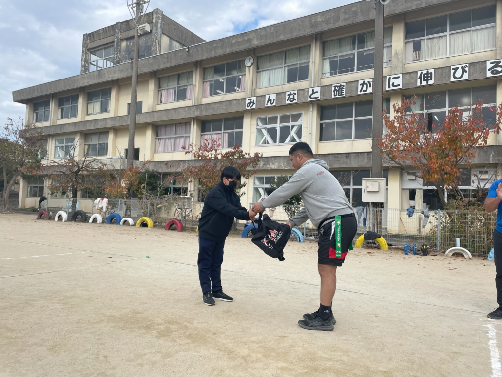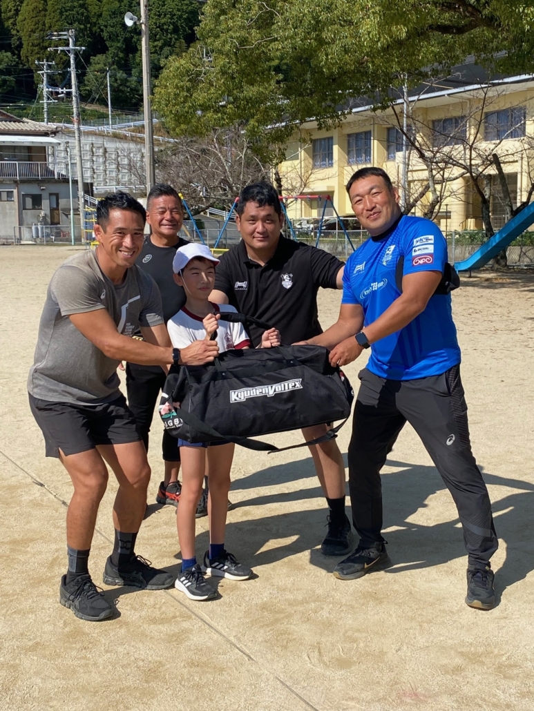 教室の最後に、九州電力玄海総合事務所からタグラグビーセットが贈呈されました。小学校に戻って、またタグラグビーを楽しんでください!