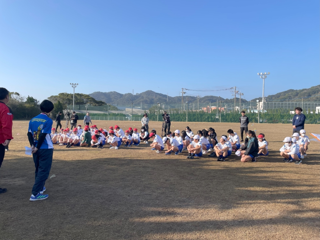 この日は、子どもたちが普段学習している学校から、早稲田佐賀ラグビー場まで歩いて向かいました。冬の澄んだ空気の中、友達とワイワイ話しながら20分かけて、元気に歩いてラグビー場まで来てくれました。