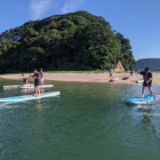 地元の中高生が、SUP体験に参加してくれました。インストラクターからしっかりと安全や漕ぎ方に関する講習を受け、いざ西の浜へ!